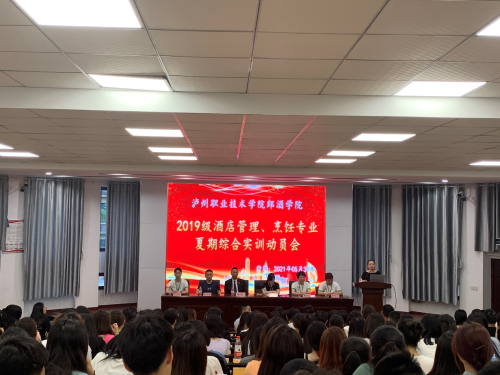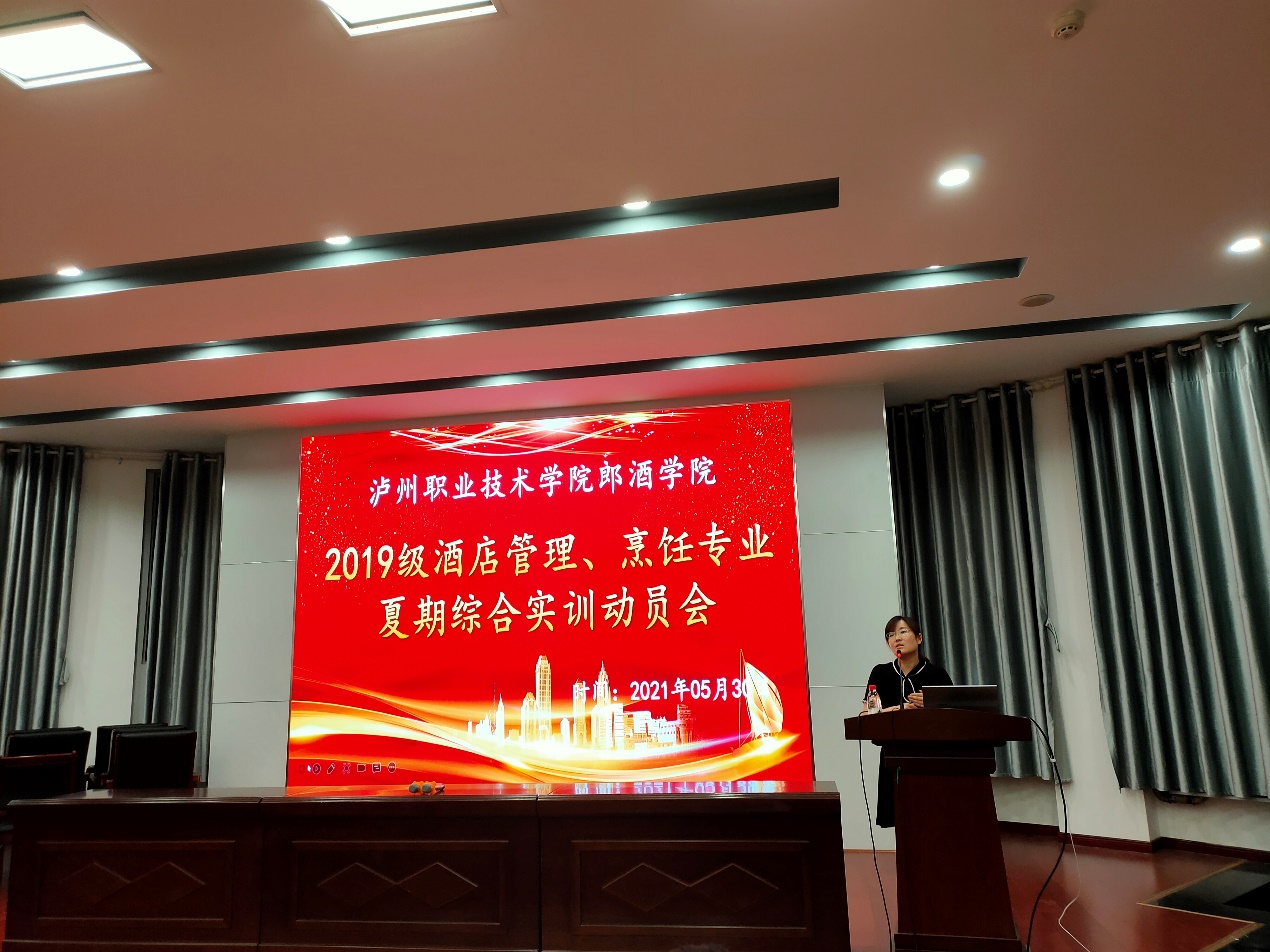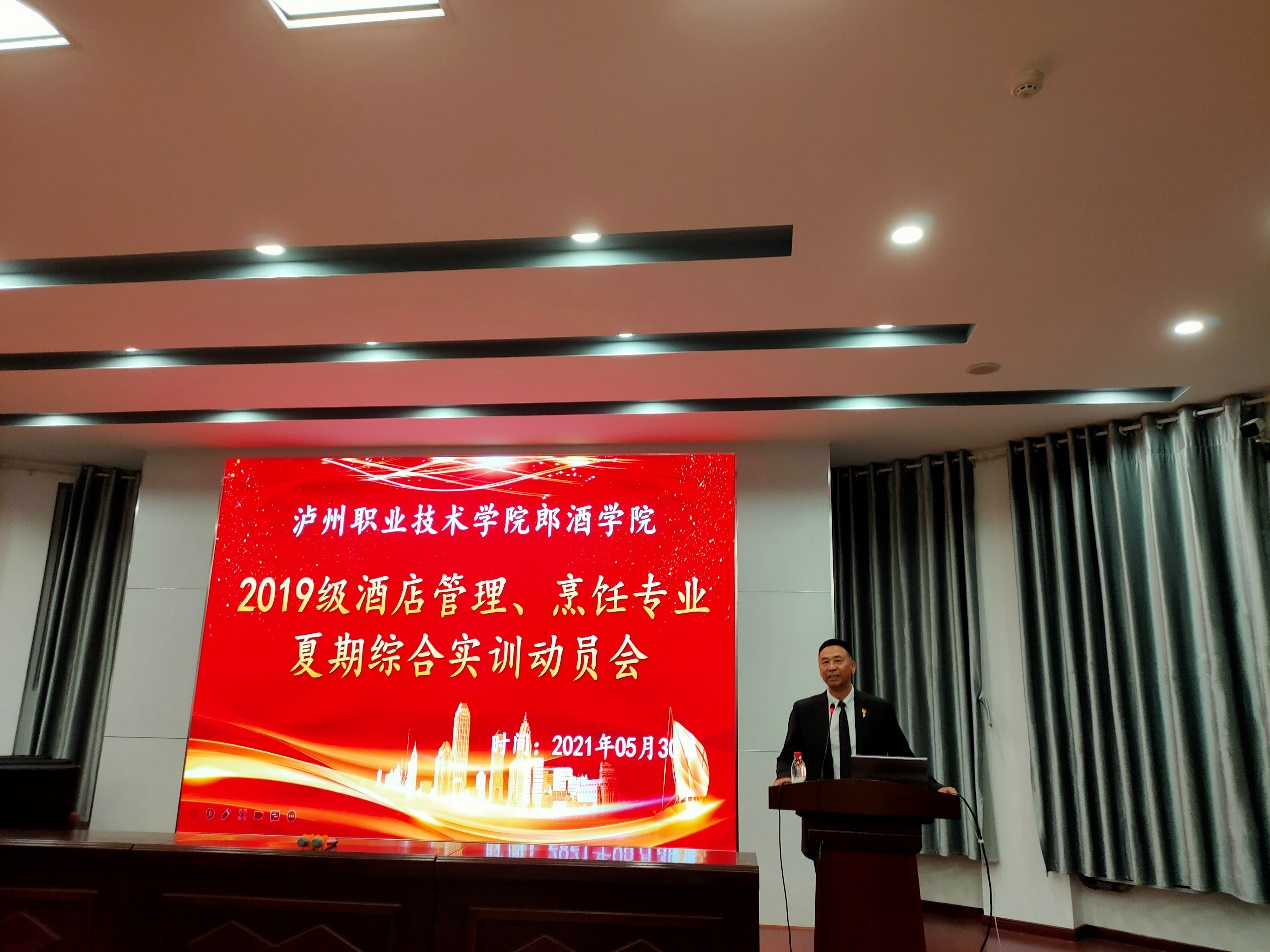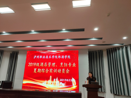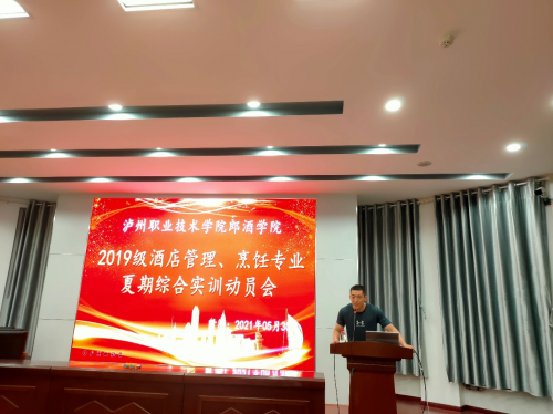 5月30日晚19:00,郎酒学院于萧秋厅举办2019级酒店管理、烹饪专业夏期综合实训动员大会。龙涧假日酒店总经理曹金红、人力资源部经理殷茂林、人力资源部主管李雪冰;泸州建国饭店总经理侯军、人力资源部经理郝兆春;郎酒学院副经理梁陶、实训中心主任王菲、酒店教研室专业老师以及19级各班辅导员参加此次动员会,会议由教研室刘利亚老师主持。