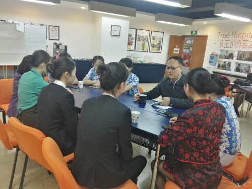 老师们看望了在各个岗位上工作的员工,了解他们的工作情况。随后,召开座谈会与同学们进行交心谈心,会上大家分享了他们在工作期间的心得和收获,刘经理对同学们的工作进行了肯定,对表现优秀的同学高度赞扬,鼓励同学们要注重提升自身的学习能力,做好职业规划,为今后的职业生涯打下坚实的基础。刘经理一行还与用人单位进行了深入地交流,洲际酒店对员工的工作情况感到满意,并结合当前企业的用工需求,给专业建设和人才培养提出了积极的建议。