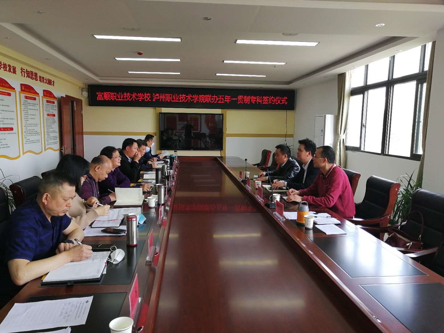 官忠华对陈雄一行表示欢迎,并介绍了富顺职业技术学校发展历程、办学理念、办学思路等情况,陈雄介绍了公司的发展历程、发展目标和此行目的,并感谢富顺职业技术学校热情接待;随后,双方围绕《四川省教育厅关于推进中高职衔接五年贯通培养工作的通知》从政策层面上对合作机制、办学模式及专业建设等进行了深入交流,达成中高职衔接五年贯通培养合作机制并现场签订了两校联办五年一贯制合作协议。