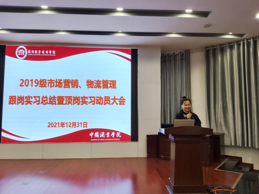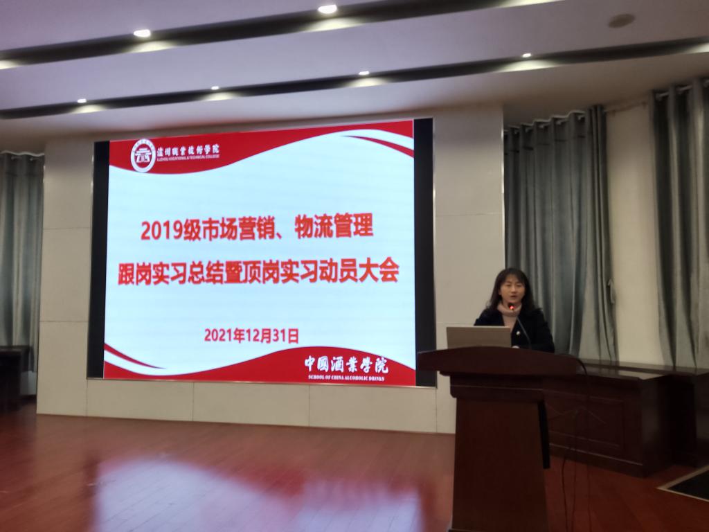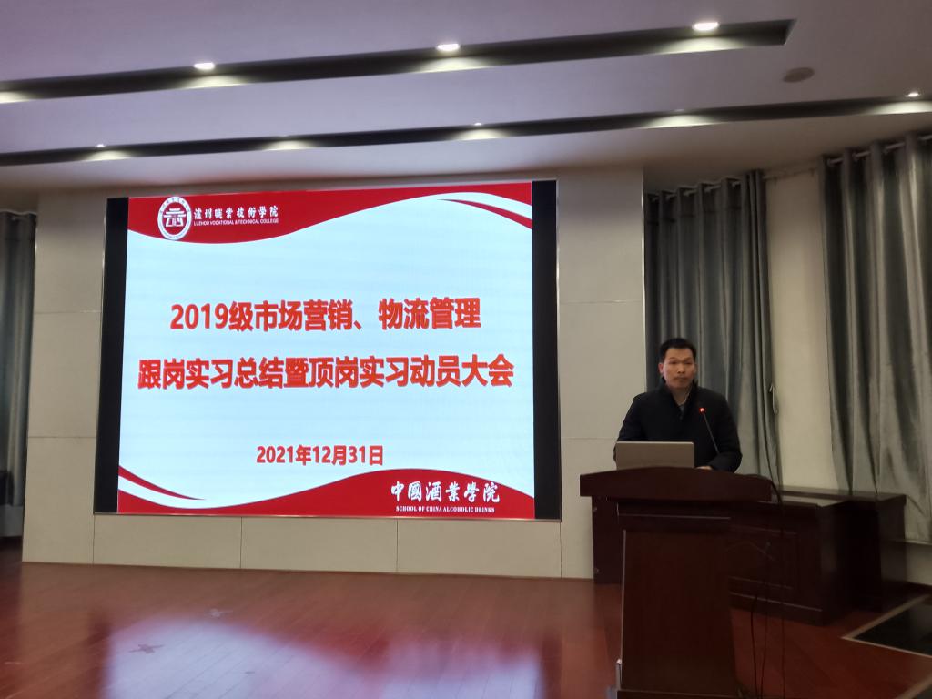 12月31日上午,中国酒业公司在萧秋厅召开2019级市场营销、现代物流管理专业学期跟岗实习总结暨顶岗实习动员大会。迪卡侬(上海)体育用品有限公司、泸州经纬翰祯商贸有限公司、泸州树清酒庄酒业有限公司等7家企业代表;中国酒业公司党总支书记丁可、经理刘竟成、副书记张志炜、副经理邓岳、营销物流教研室全体教师及2019级参与顶岗实习全体学员参加会议。