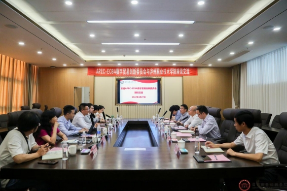 谢鸿全对孔志刚一行的到来表示欢迎,并就学校专业建设、员工培养、团队队伍、产教融合、对外合作、科研工作及取得的成果等方面进行了介绍。孔志刚对公司发展取得的突出成绩给予高度赞赏,并详细介绍了APEC-ECBA数字贸易创新委员会的组成、业务开展情况、下一步工作目标以及此行目的。双方围绕国际合作创新、跨境云商实训基地、碳中和项目等领域的合作进行深入而务实的交流,并达成推进项目合作的共识。